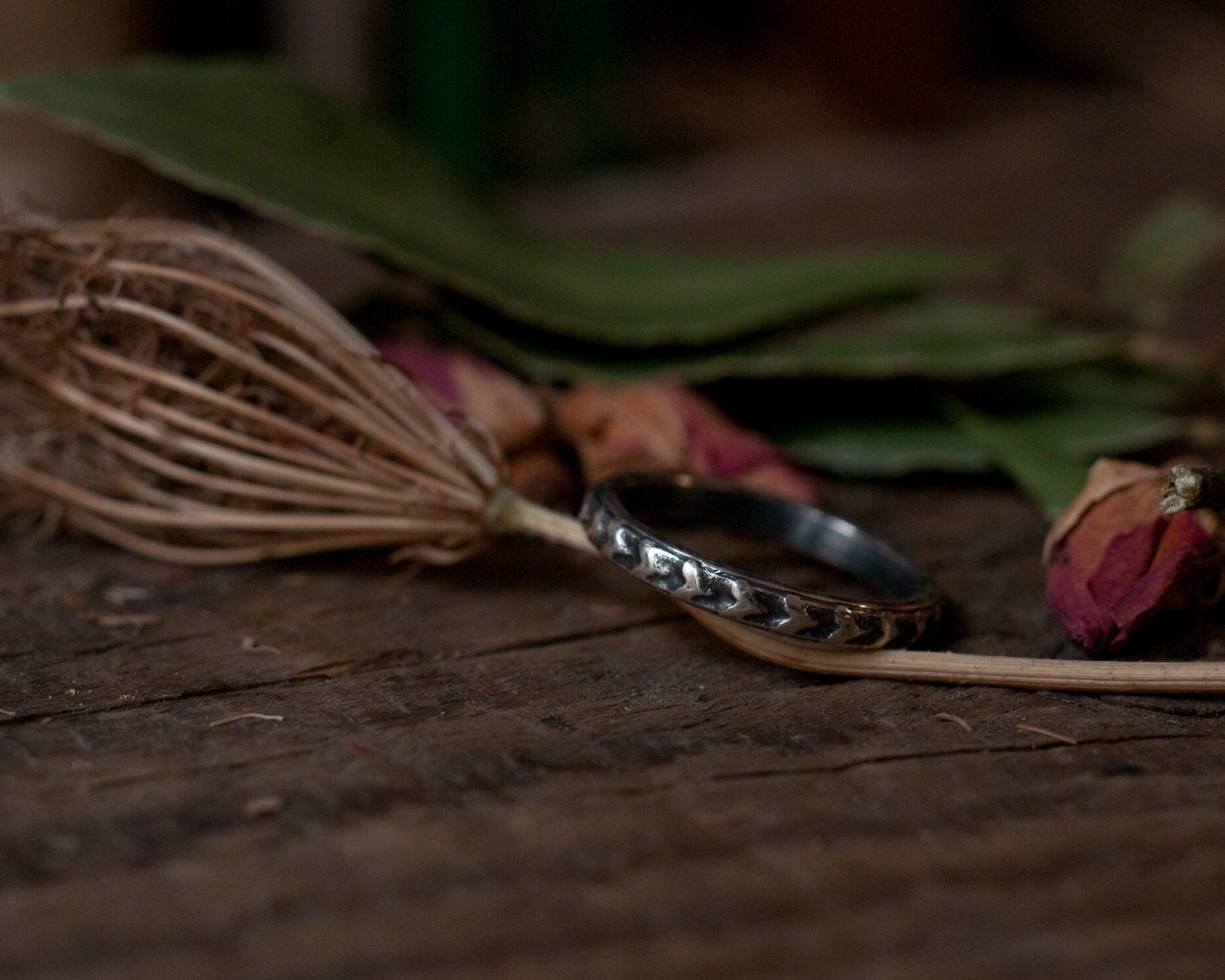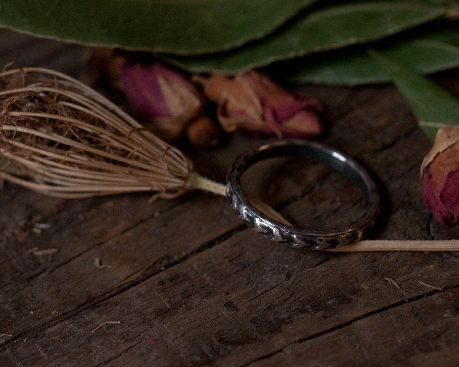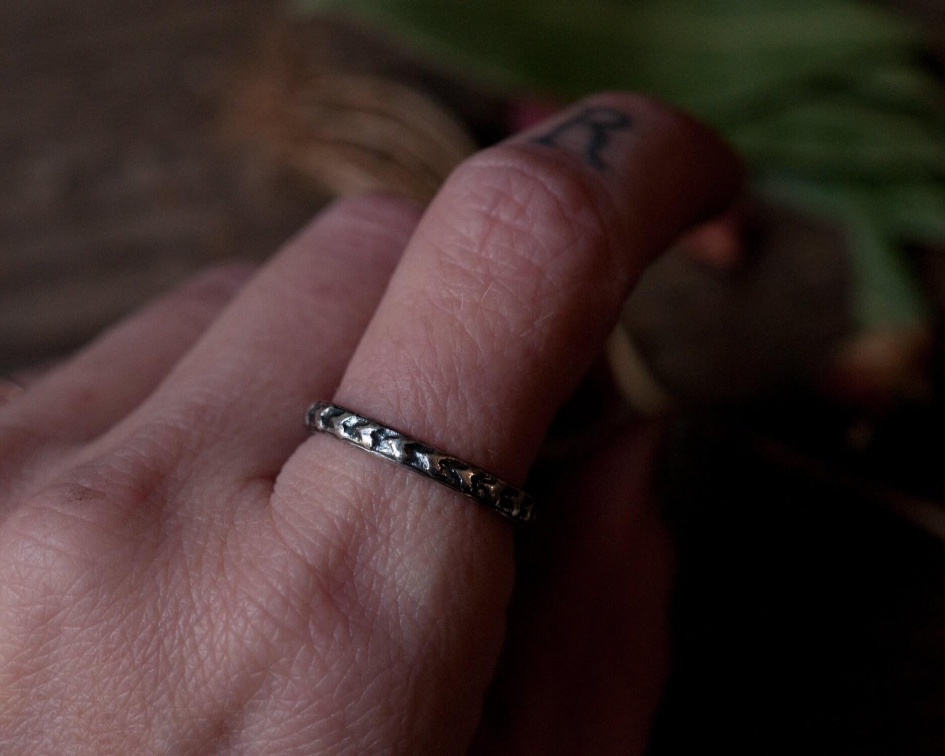 A rustic patterned band of oxidised silver that works perfectly as an alternative wedding ring or as a simple stacker (this ring can also be purchased as part of a four ring stacking set). Made with 2.5mm wire stock that has been put through a mill to produce the repeating love heart motif. This ring is a good size for both smaller and larger hands so can be worn comfortably by men, women and all the shades in between.