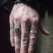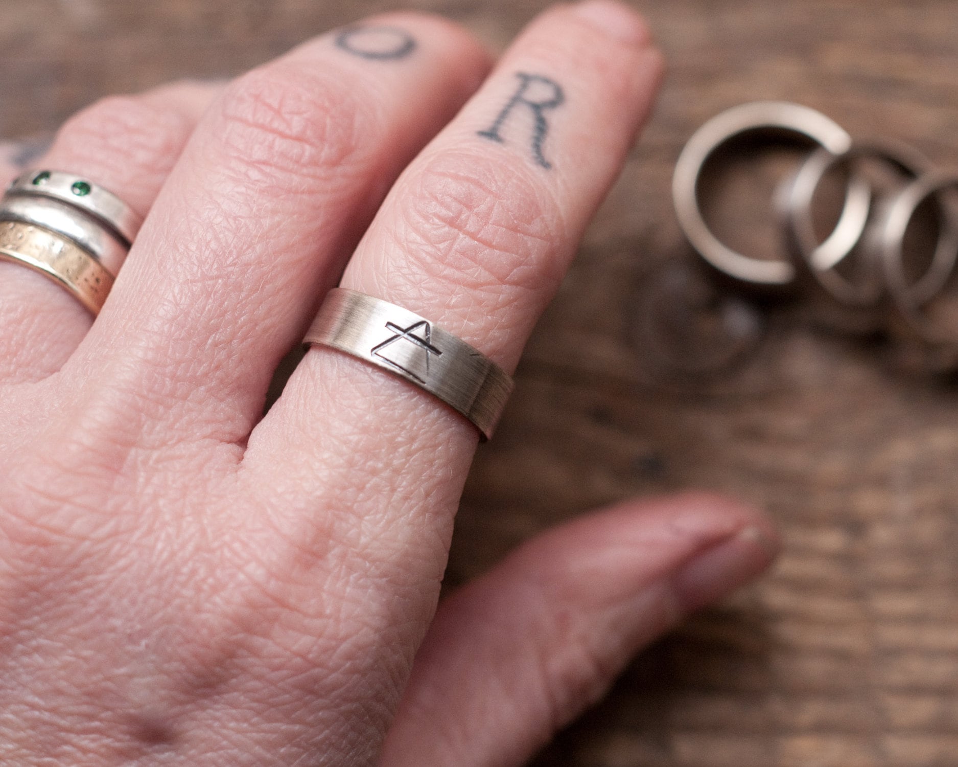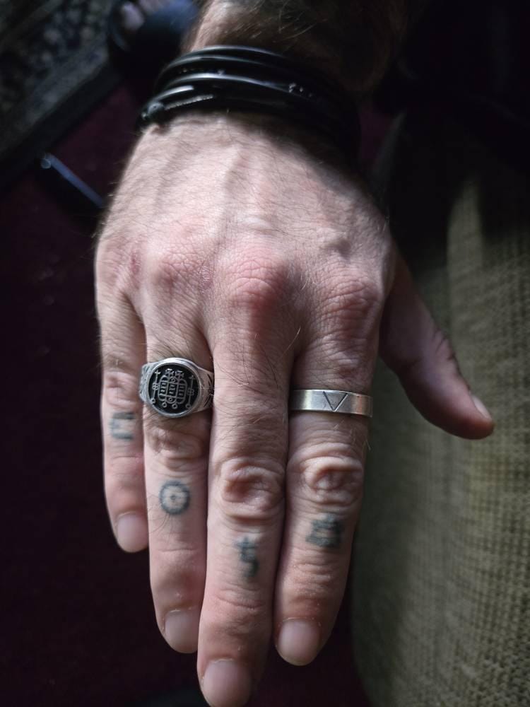 Elemental rings bearing the Alchemical symbols for Earth, Air, Fire and Water fabricated from sterling silver and hand stamped. Each ring is sold separately and can be stacked with others. The bands are all 6mm wide and 1.5mm thick, oxidised and then polished.