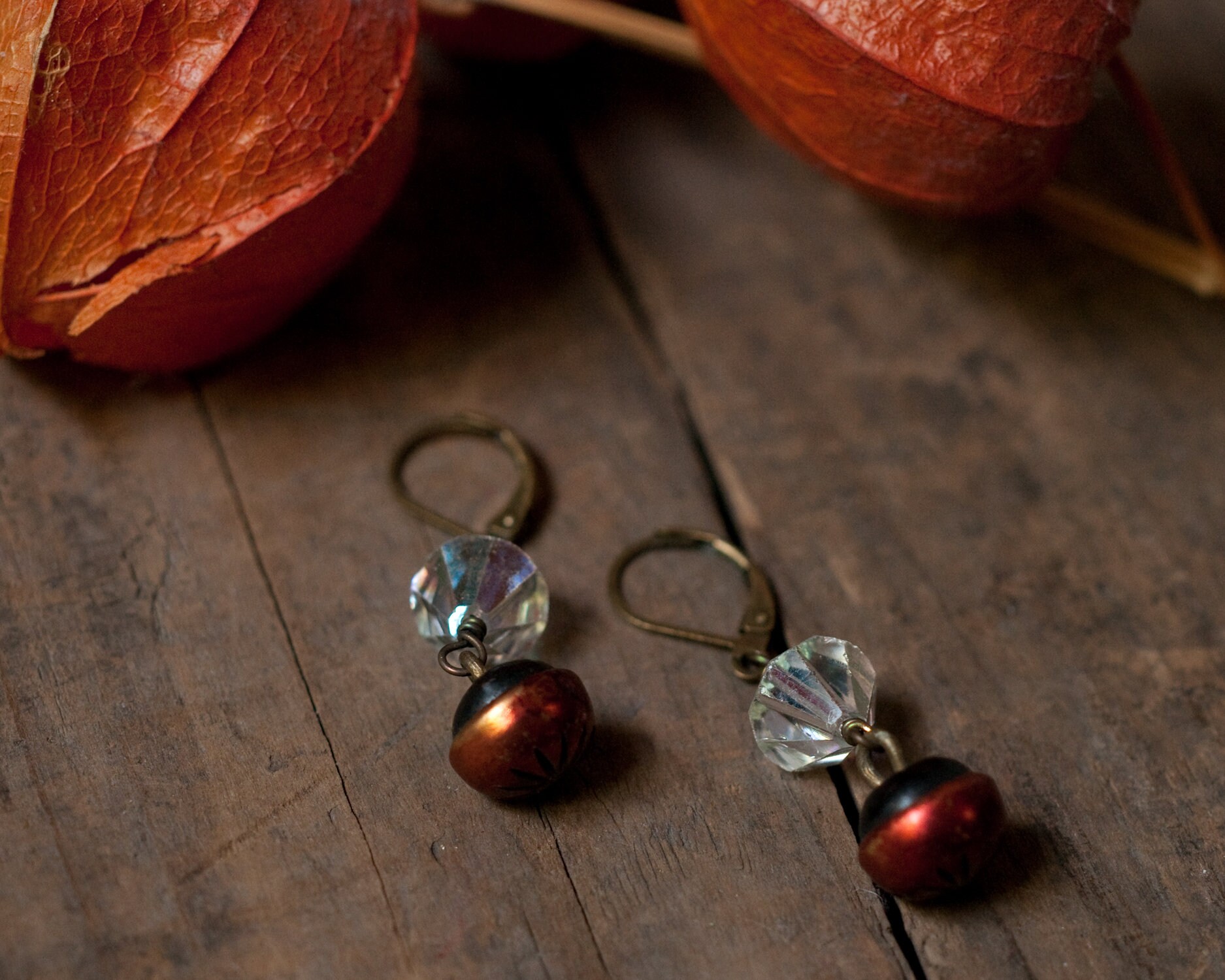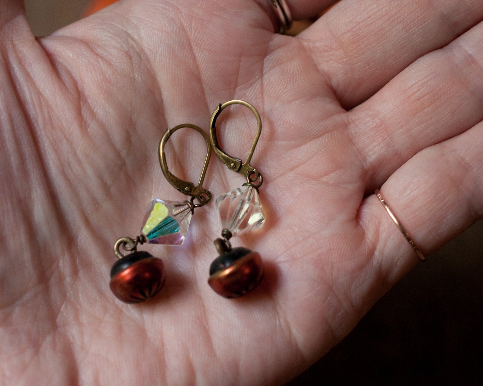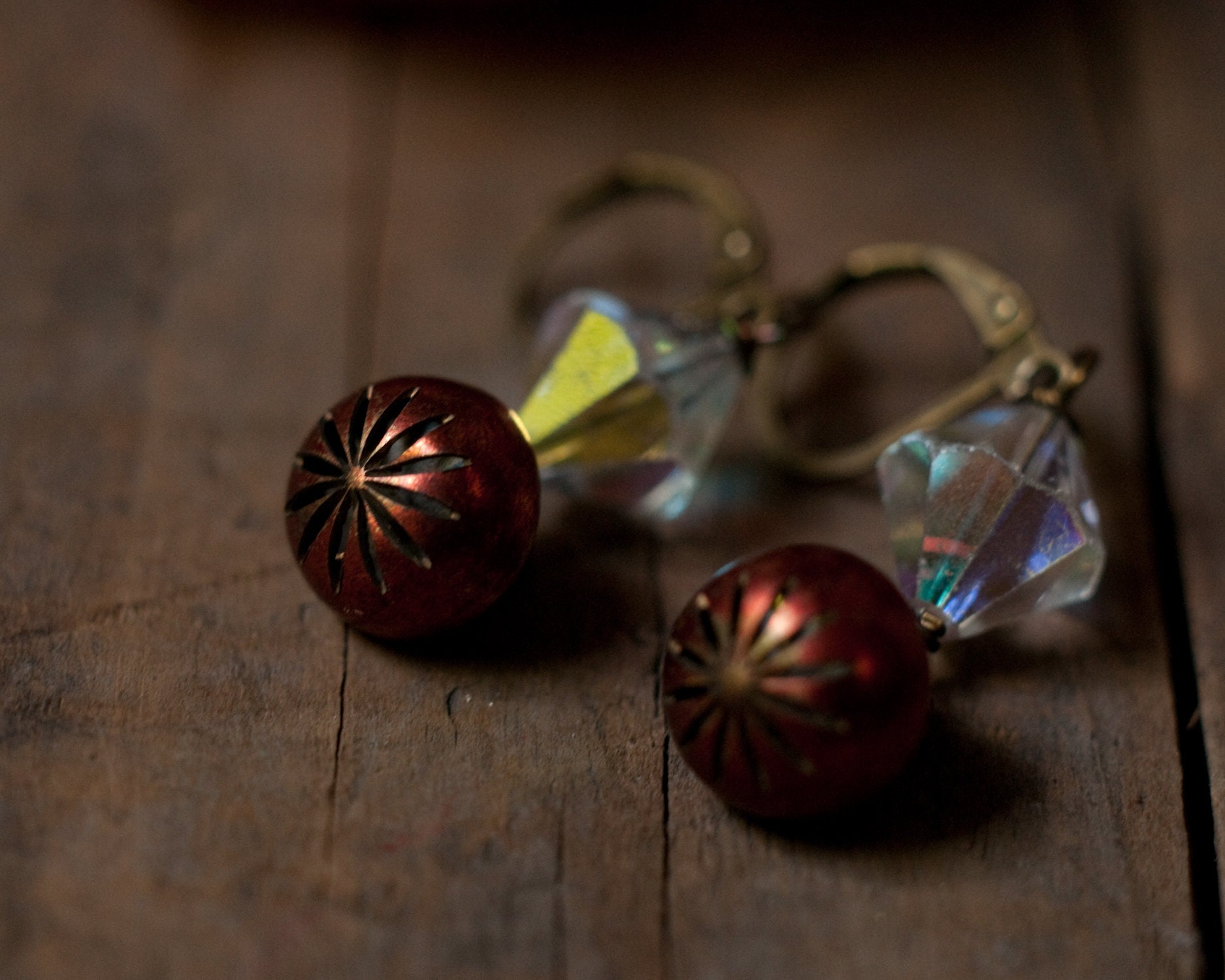 Cute cut out star burst pattern cherry red vintage buttons that remind me of Rowan berries paired with mid century iridescent bi-cone glass beads. The wire work are lever backs are in brass. Approximately 2.5cm in length.