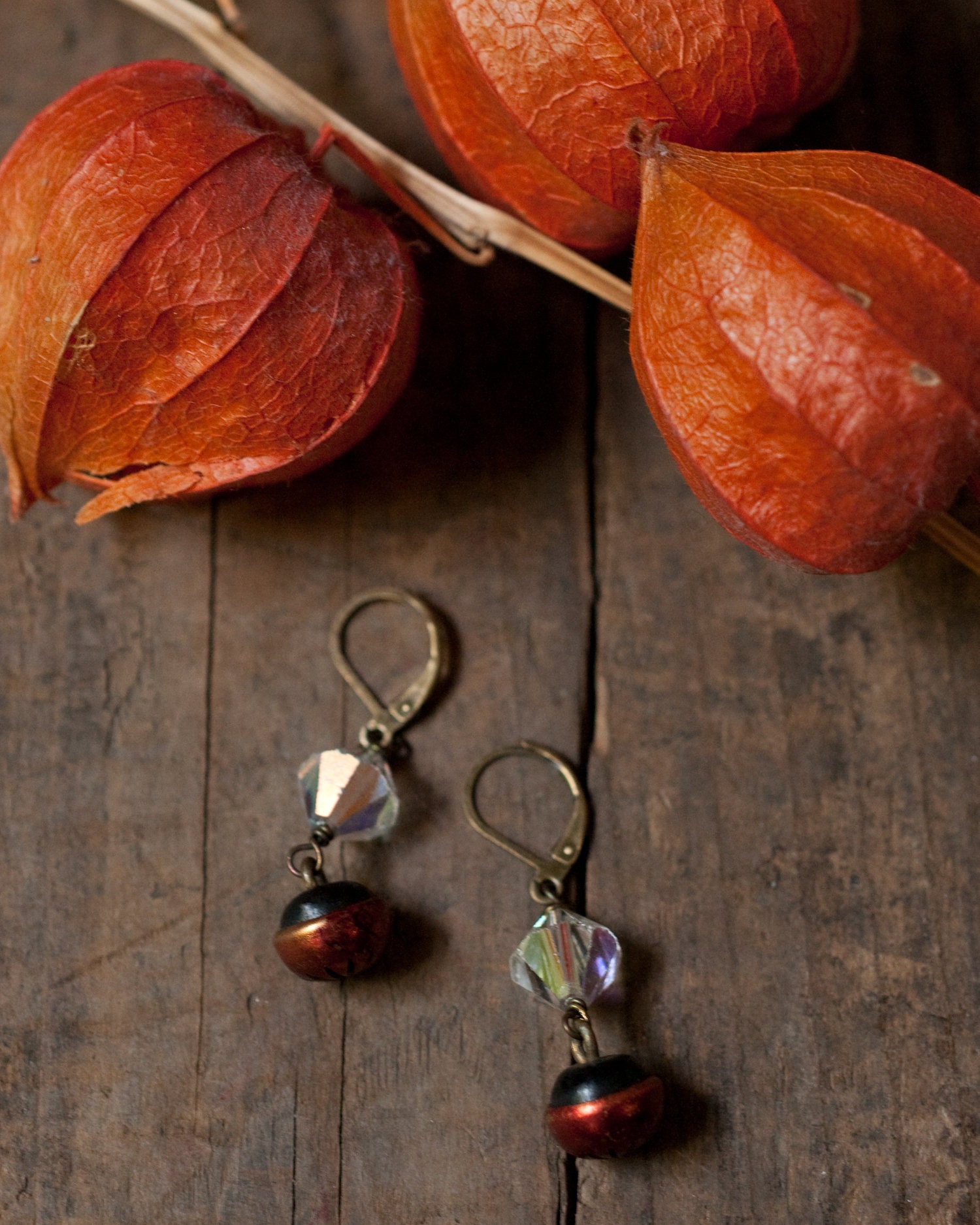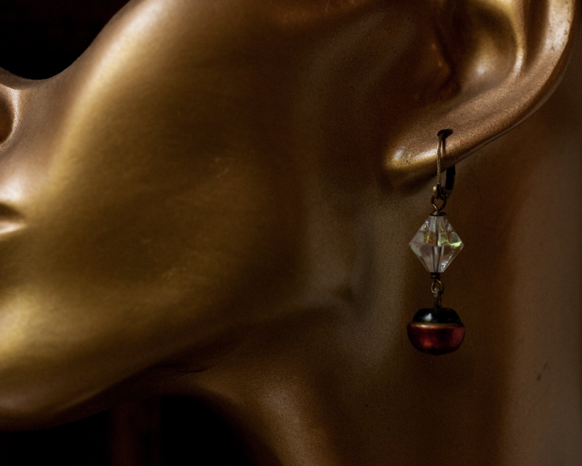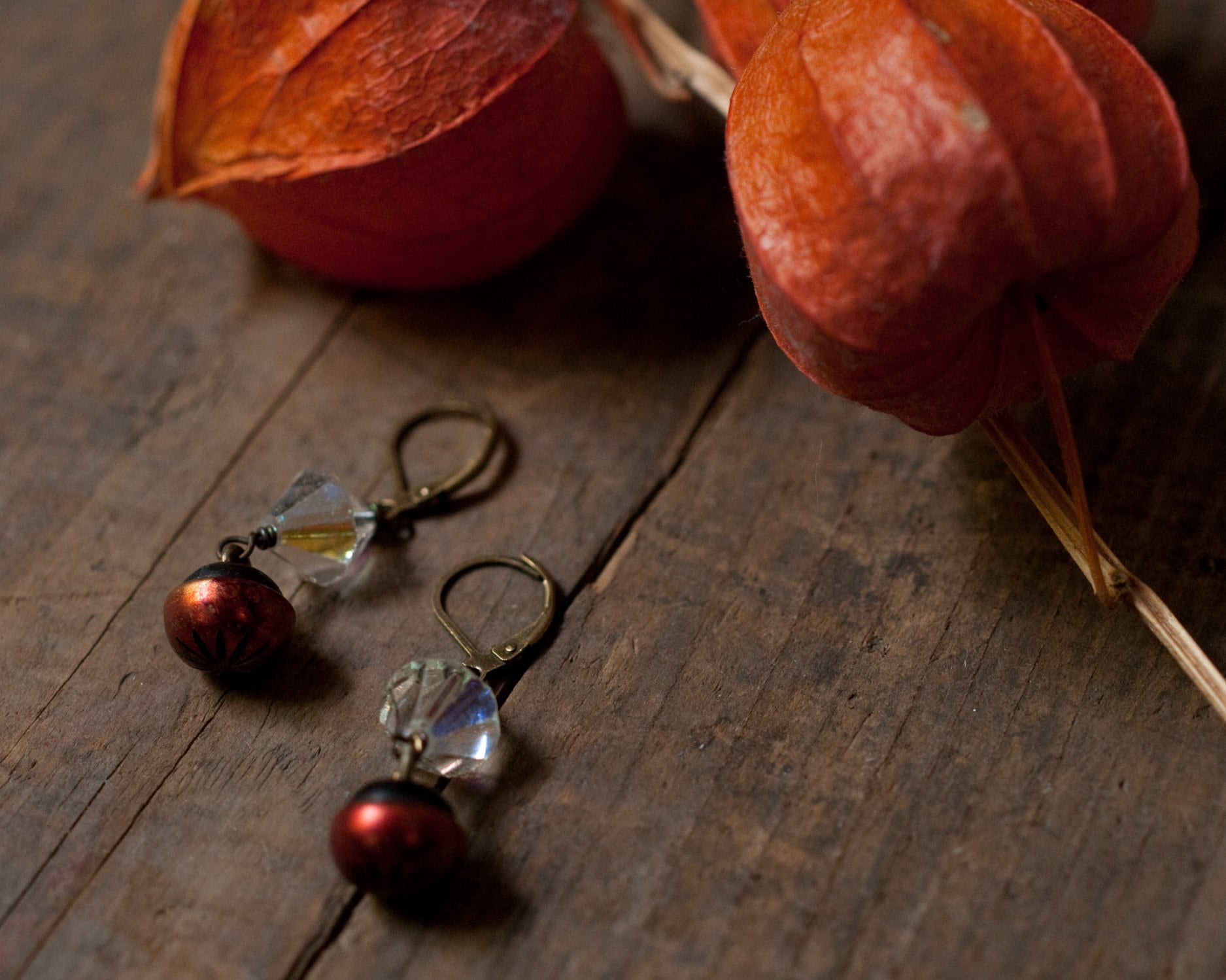 Cute cut out star burst pattern cherry red vintage buttons that remind me of Rowan berries paired with mid century iridescent bi-cone glass beads. The wire work are lever backs are in brass. Approximately 2.5cm in length.