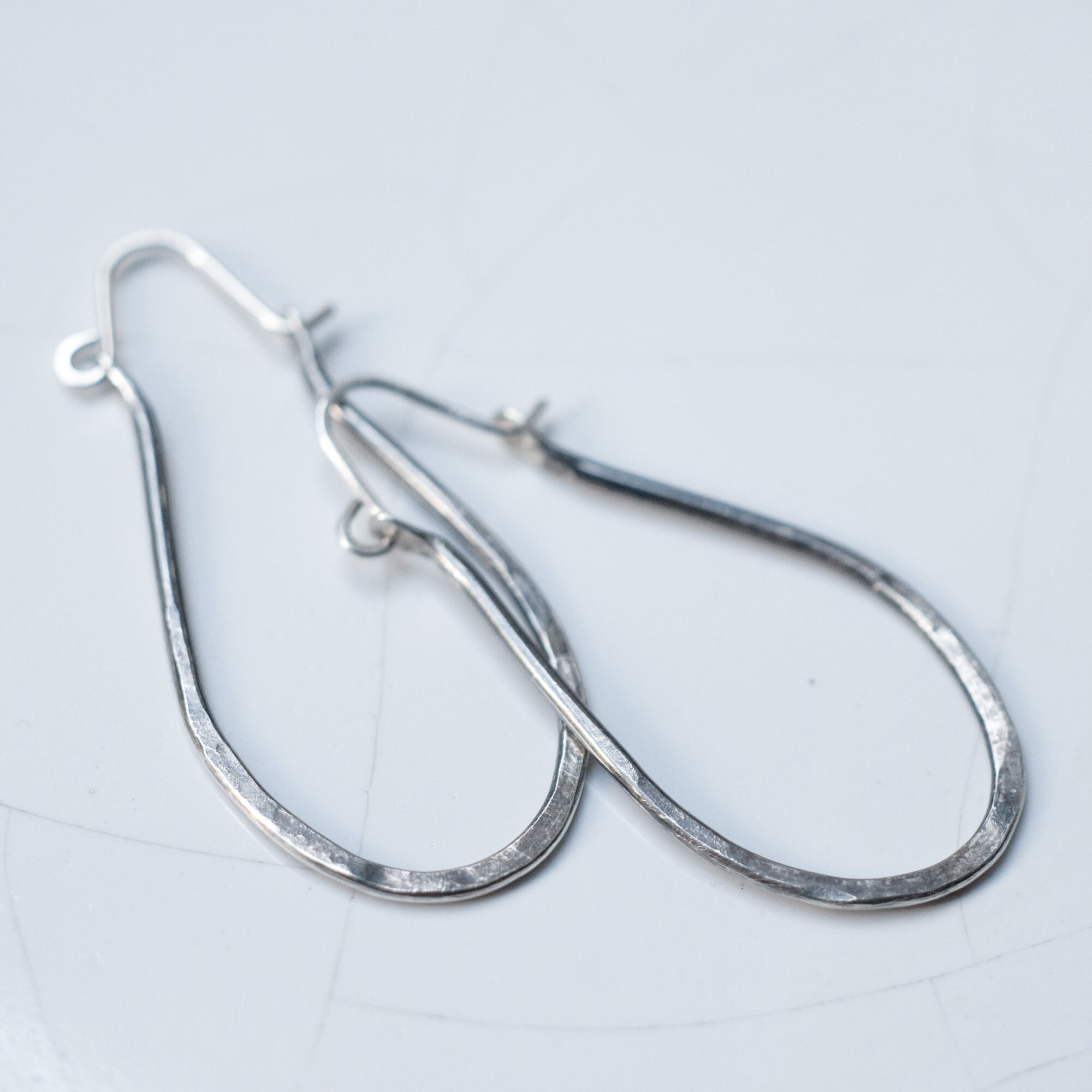 Simple, minimal elongated oval hoop earrings in rustically textured and oxidised sterling silver. These hoops measure approximately 4cm in length and are lightweight and comfortable for extended wear.