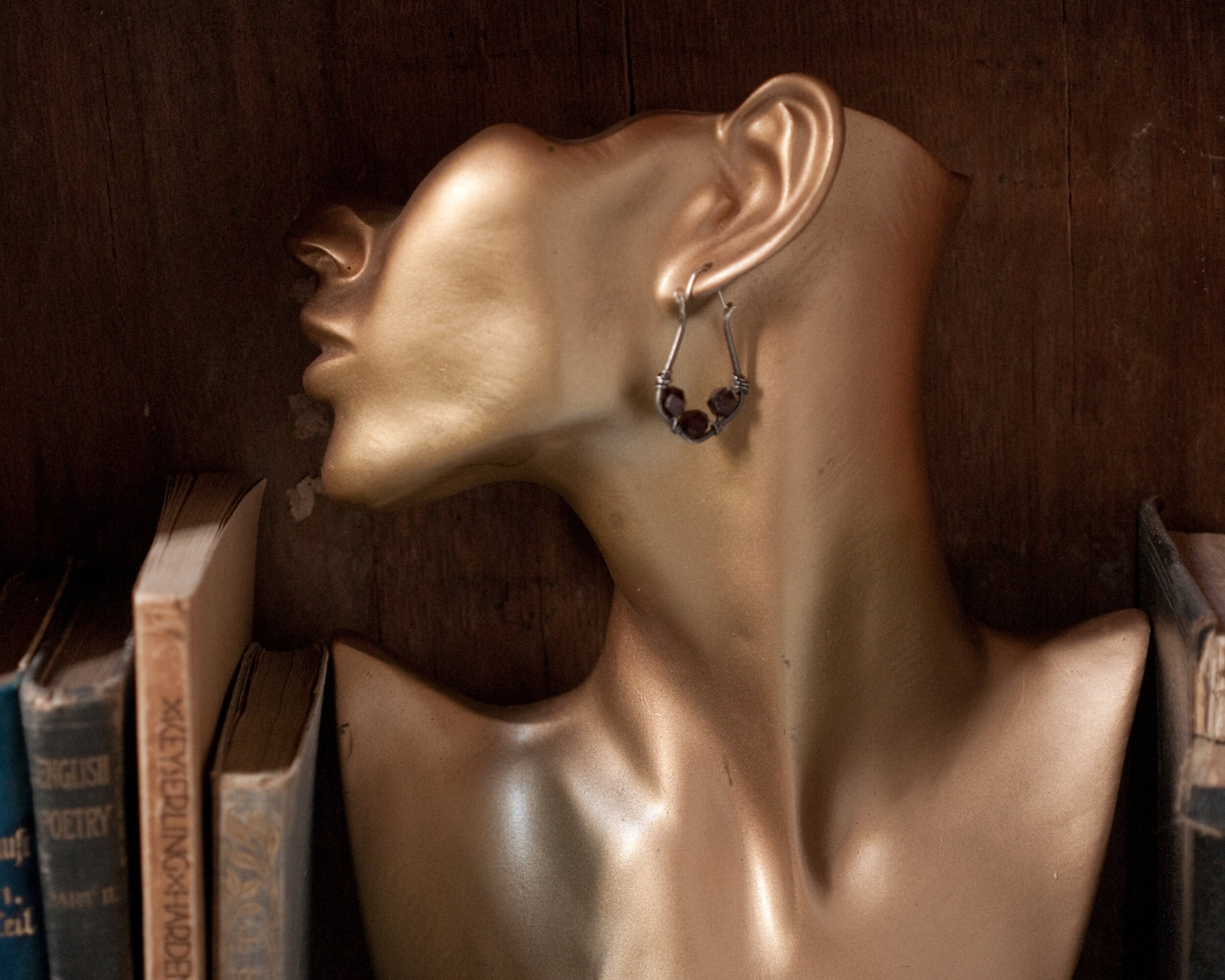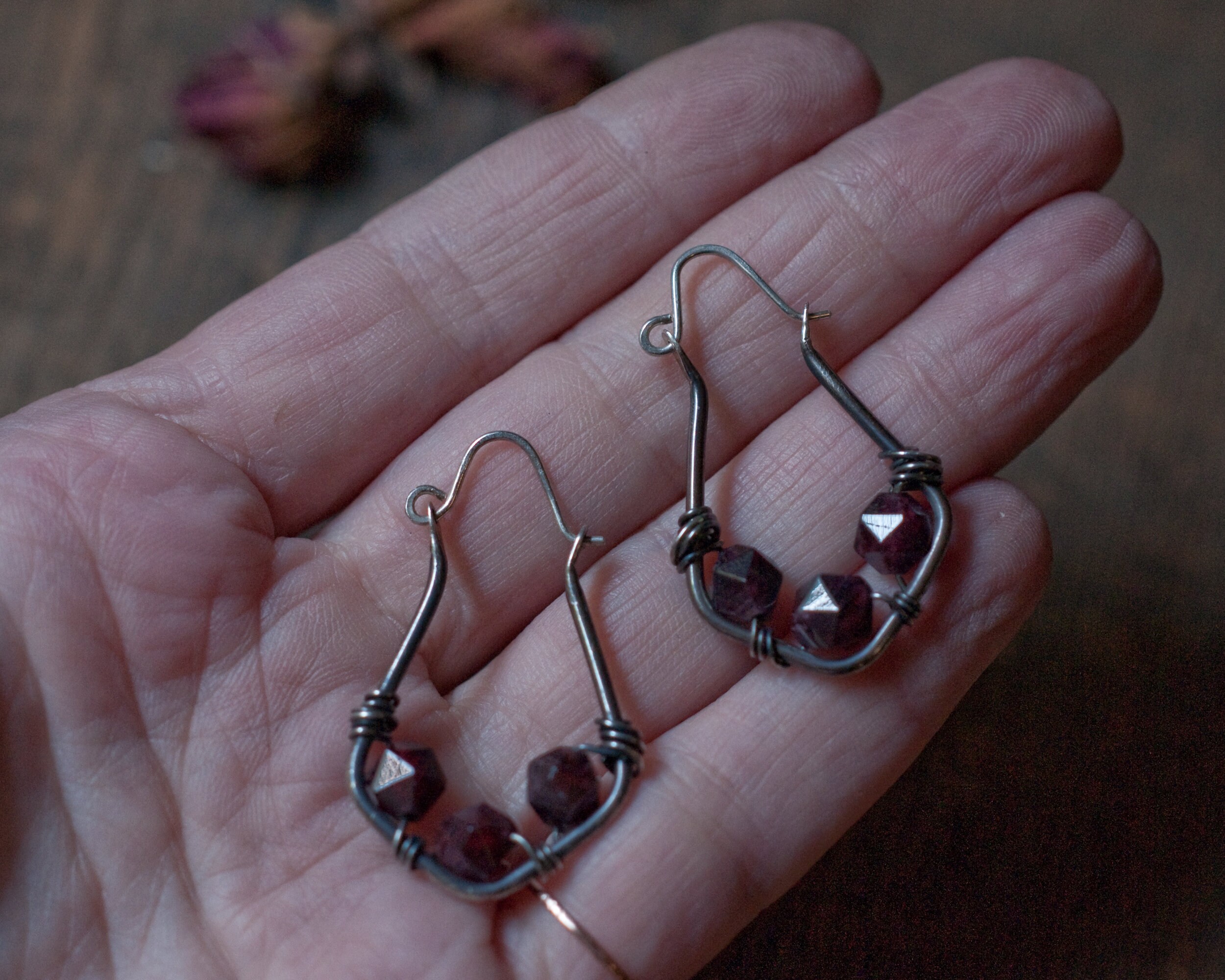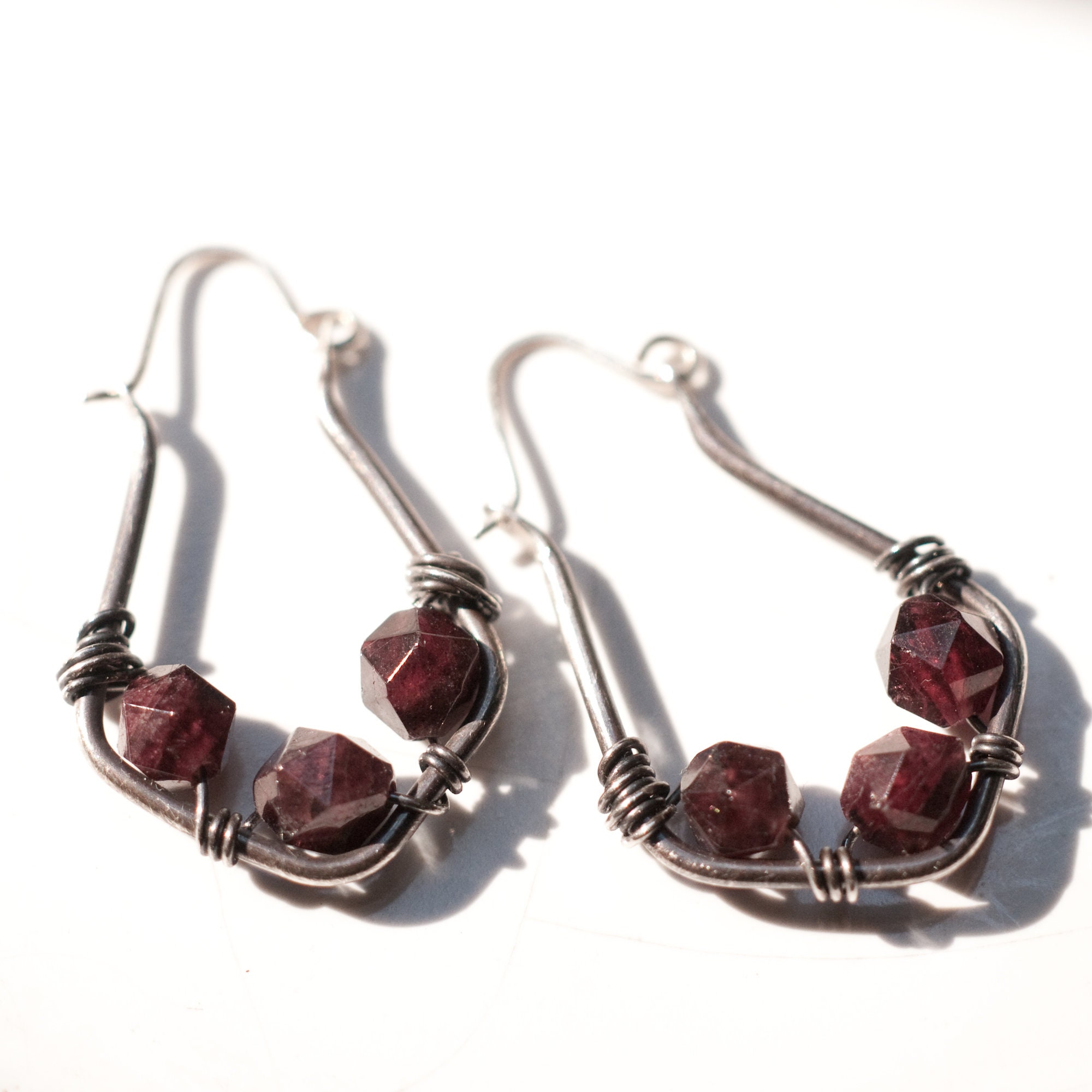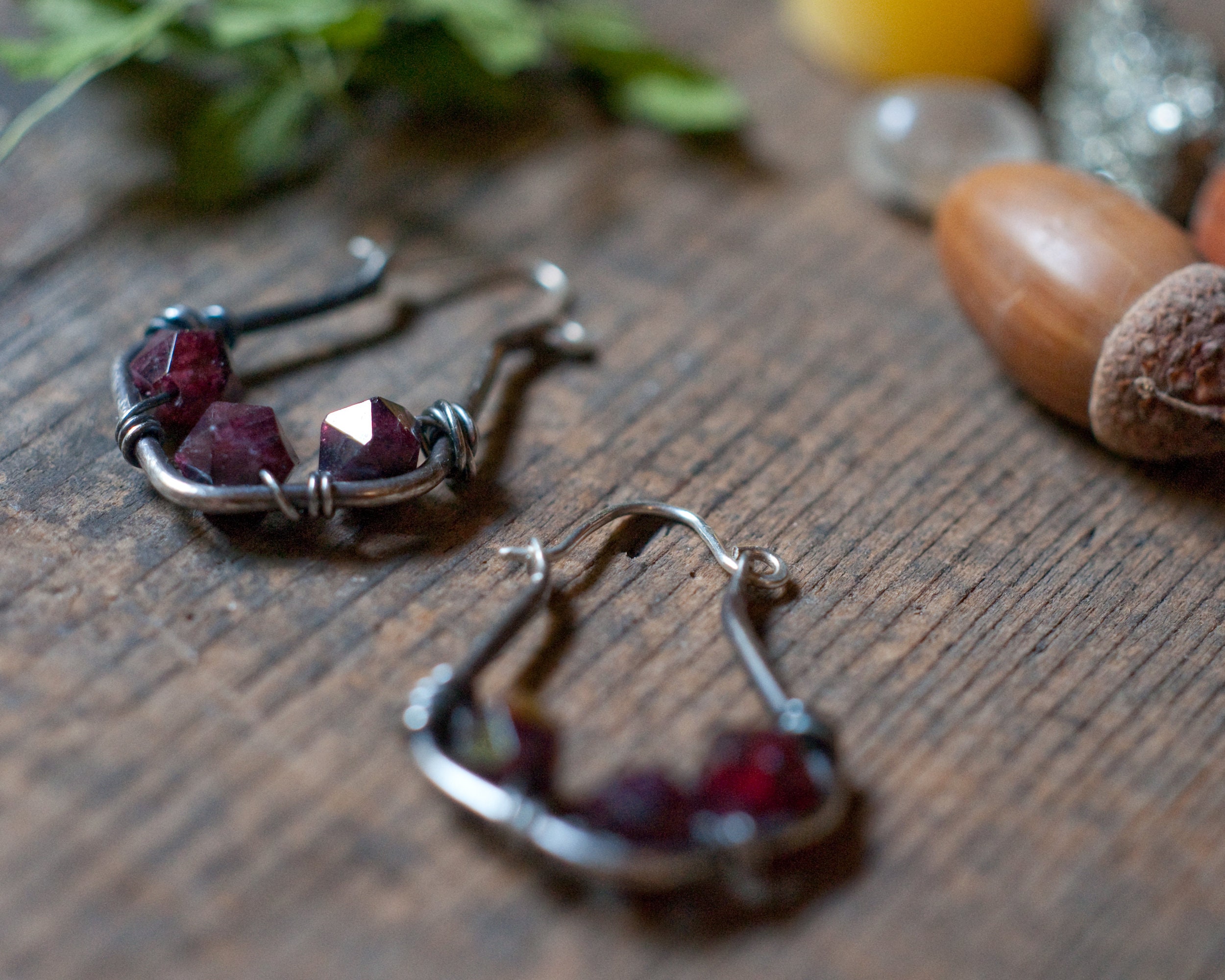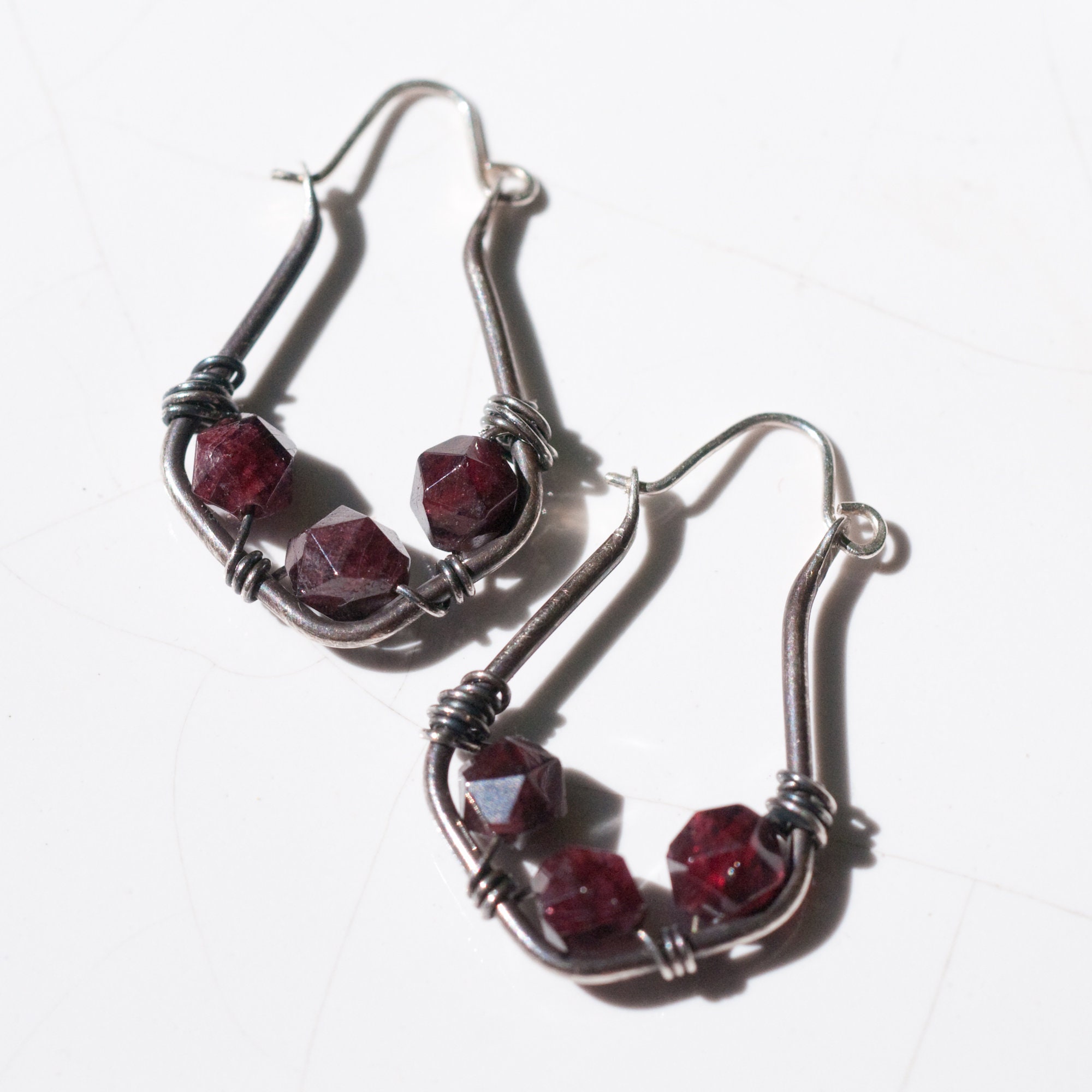 Antiqued silver geometric hoops with wire wrapped faceted garnets.