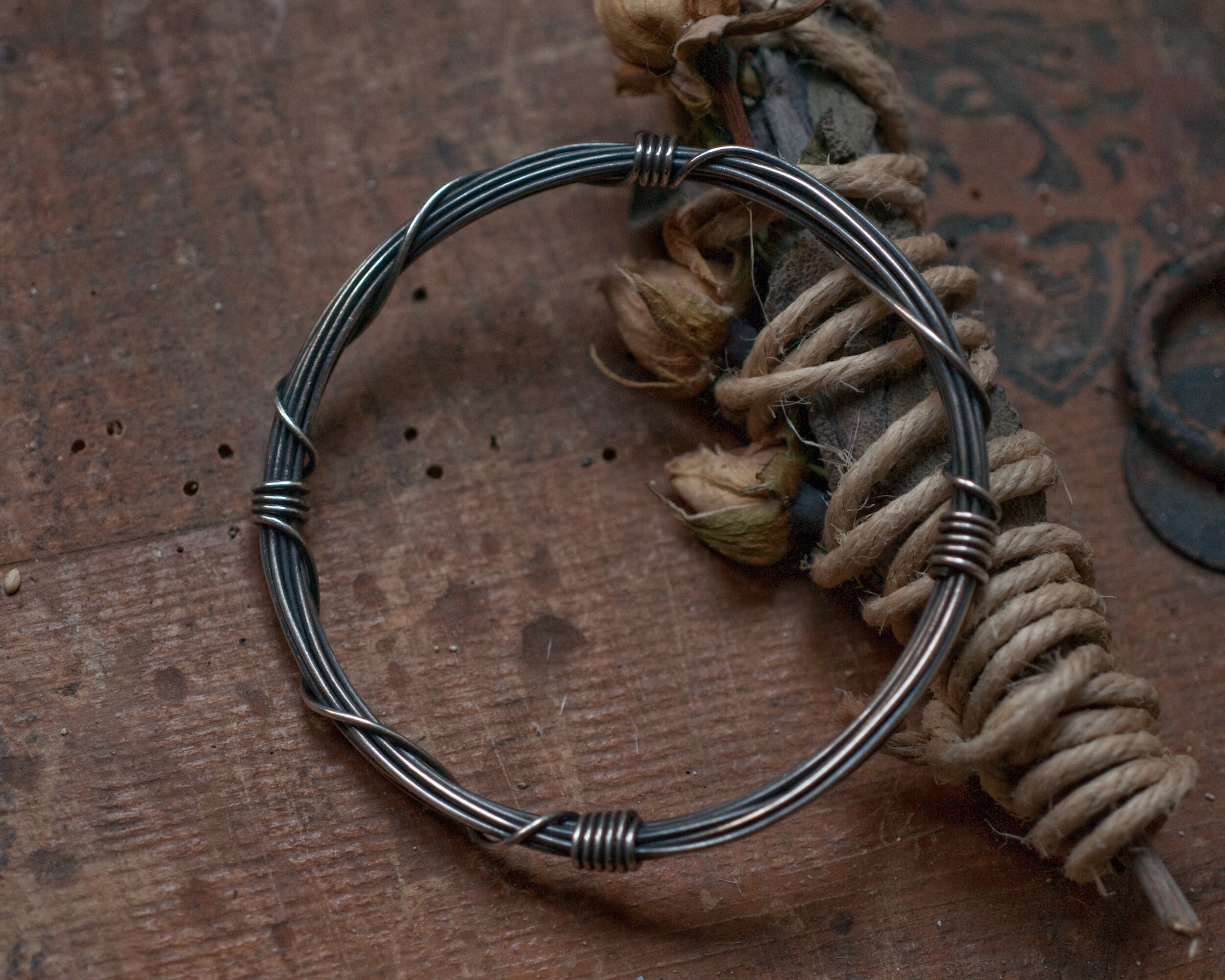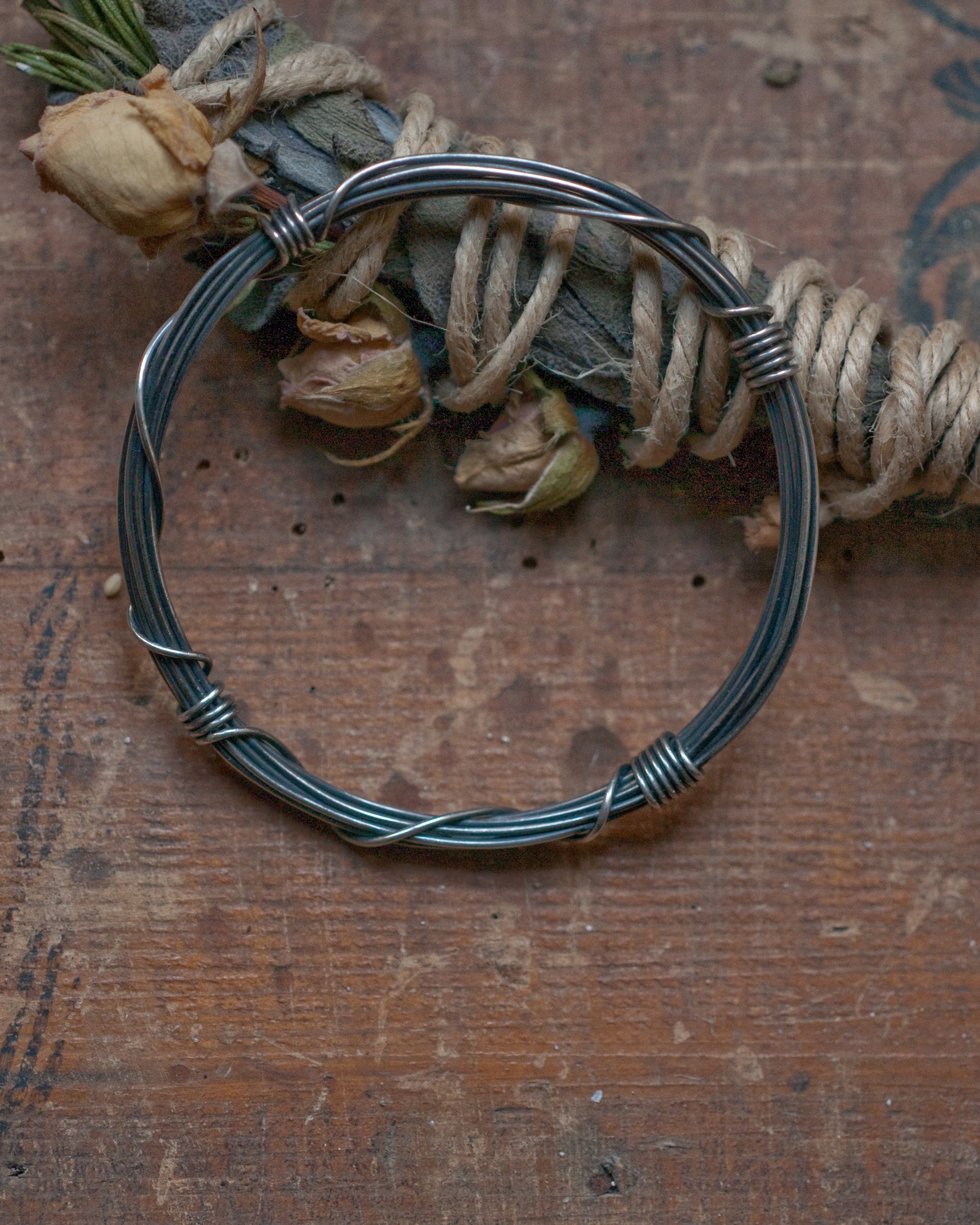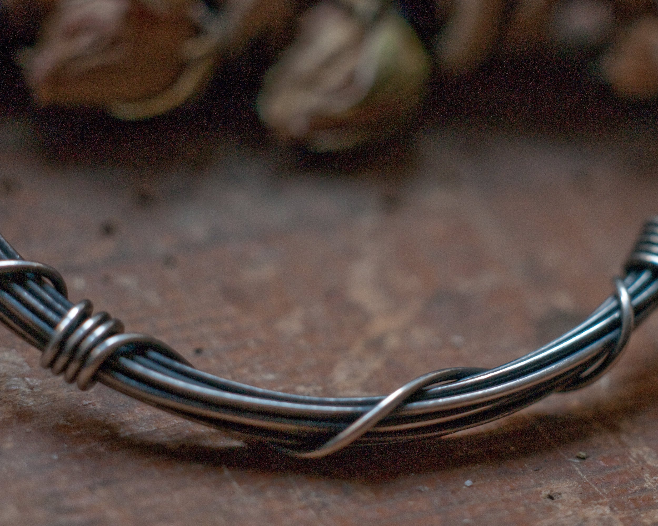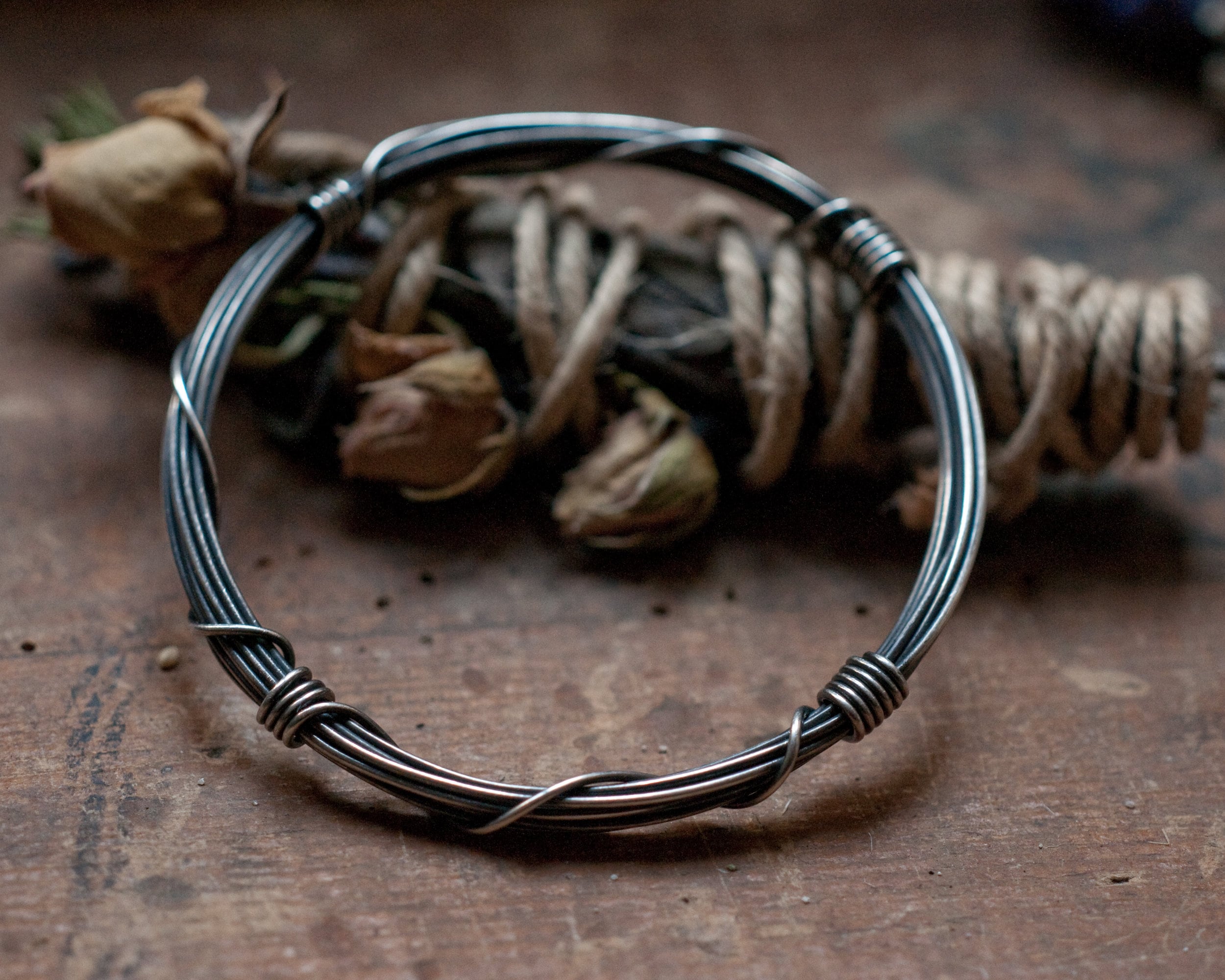 A slim version of my Gyre bangle using 3 meters of continuous blackened sterling silver wire wound around and bound with it's own ends… infinity on your wrist. The bangle is oxidised and polished to bring out the rich highlights. It works great on it's own or as a stacking bangle. This listing is for one slim bangle, also pictured are the original Gyre bangle that uses 7 meters of sterling silver wire which can be purchased here...