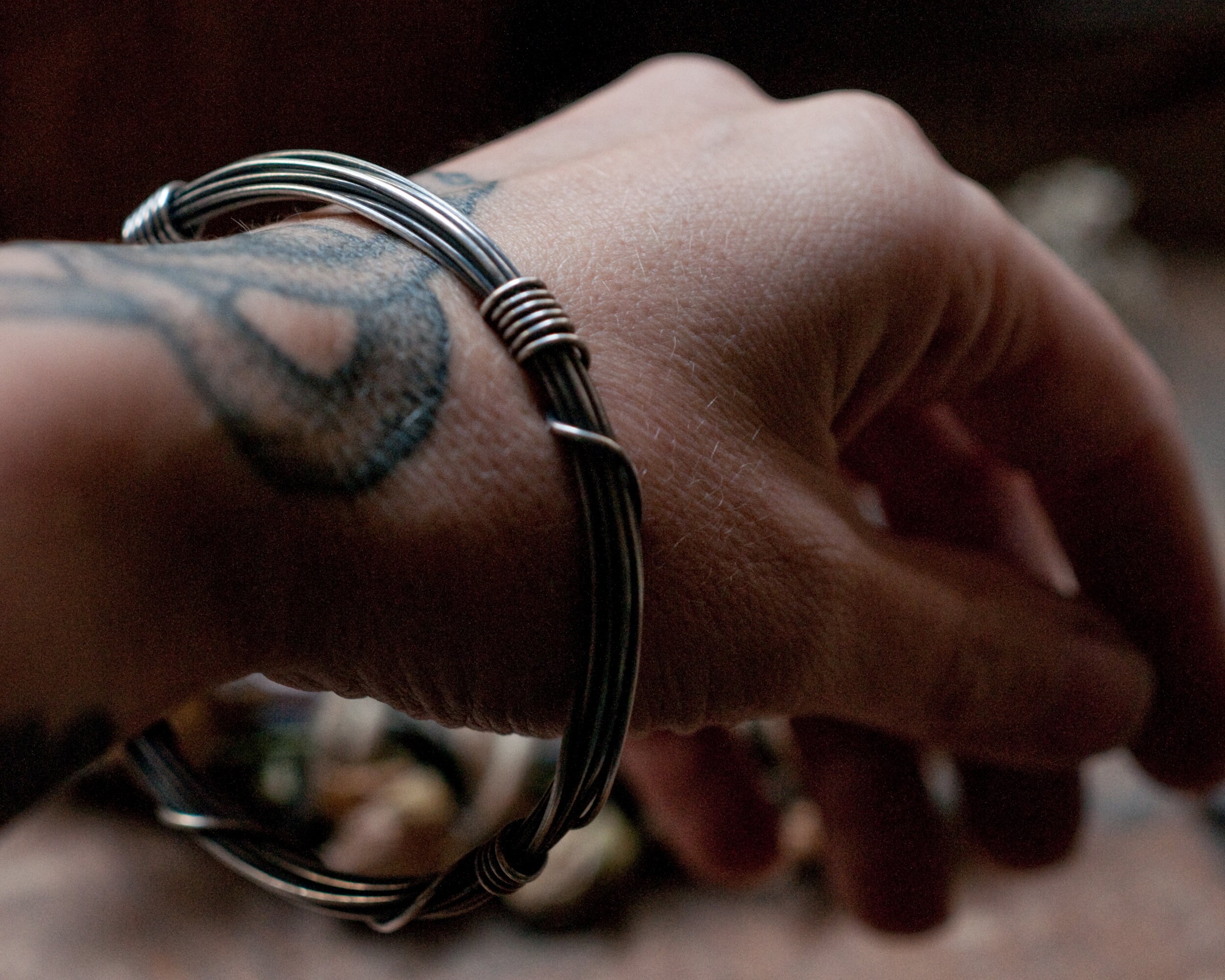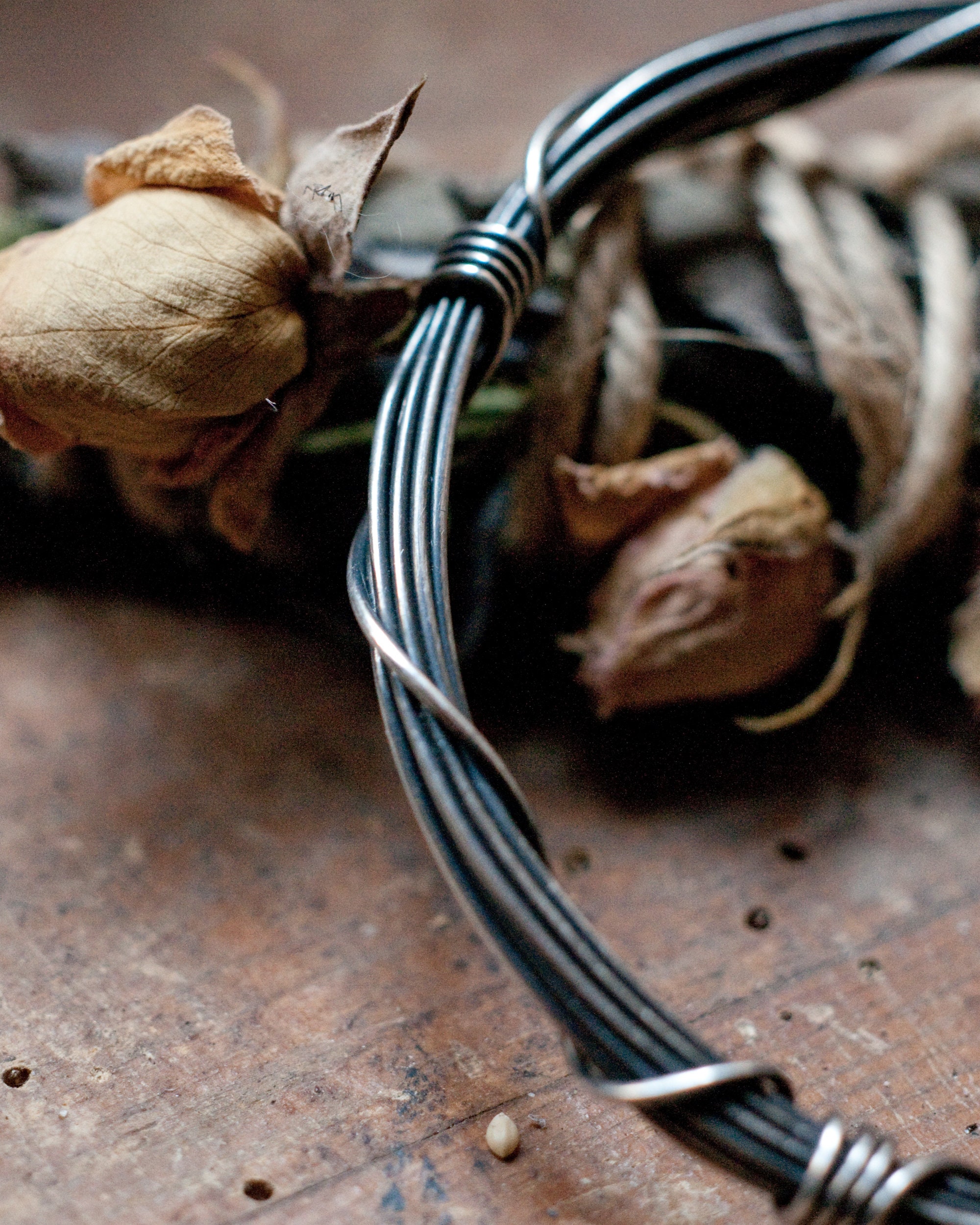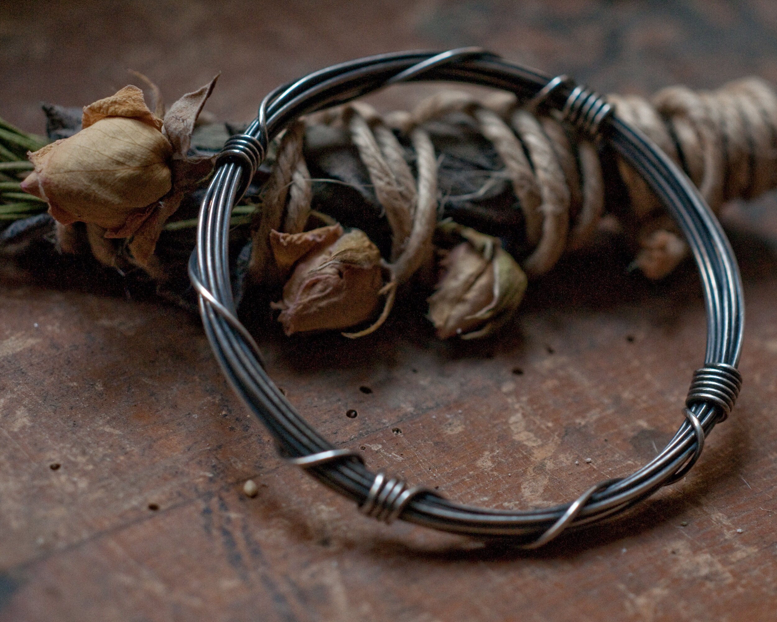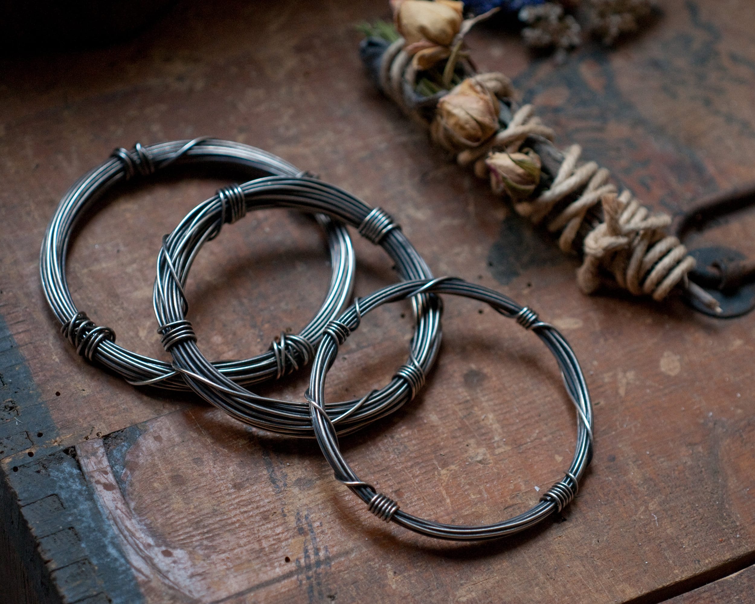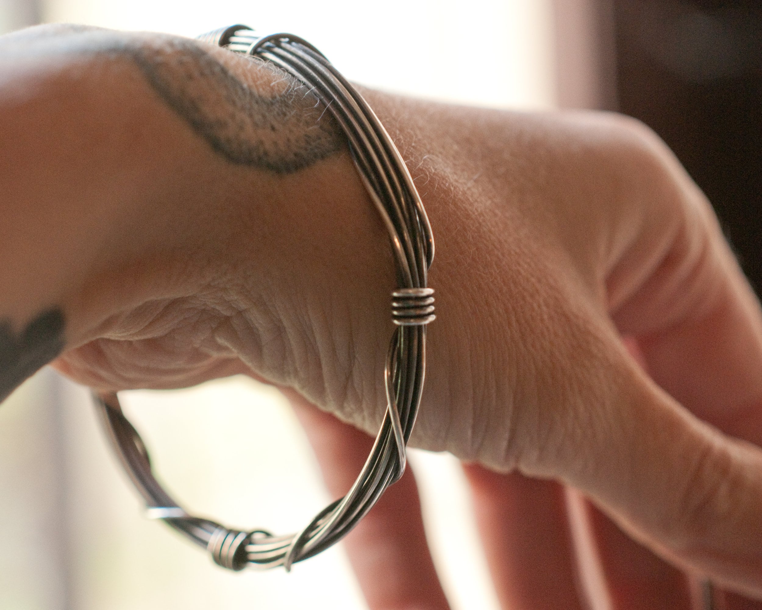 A slim version of my Gyre bangle using 3 meters of continuous blackened sterling silver wire wound around and bound with it's own ends… infinity on your wrist. The bangle is oxidised and polished to bring out the rich highlights. It works great on it's own or as a stacking bangle. This listing is for one slim bangle, also pictured are the original Gyre bangle that uses 7 meters of sterling silver wire which can be purchased here...