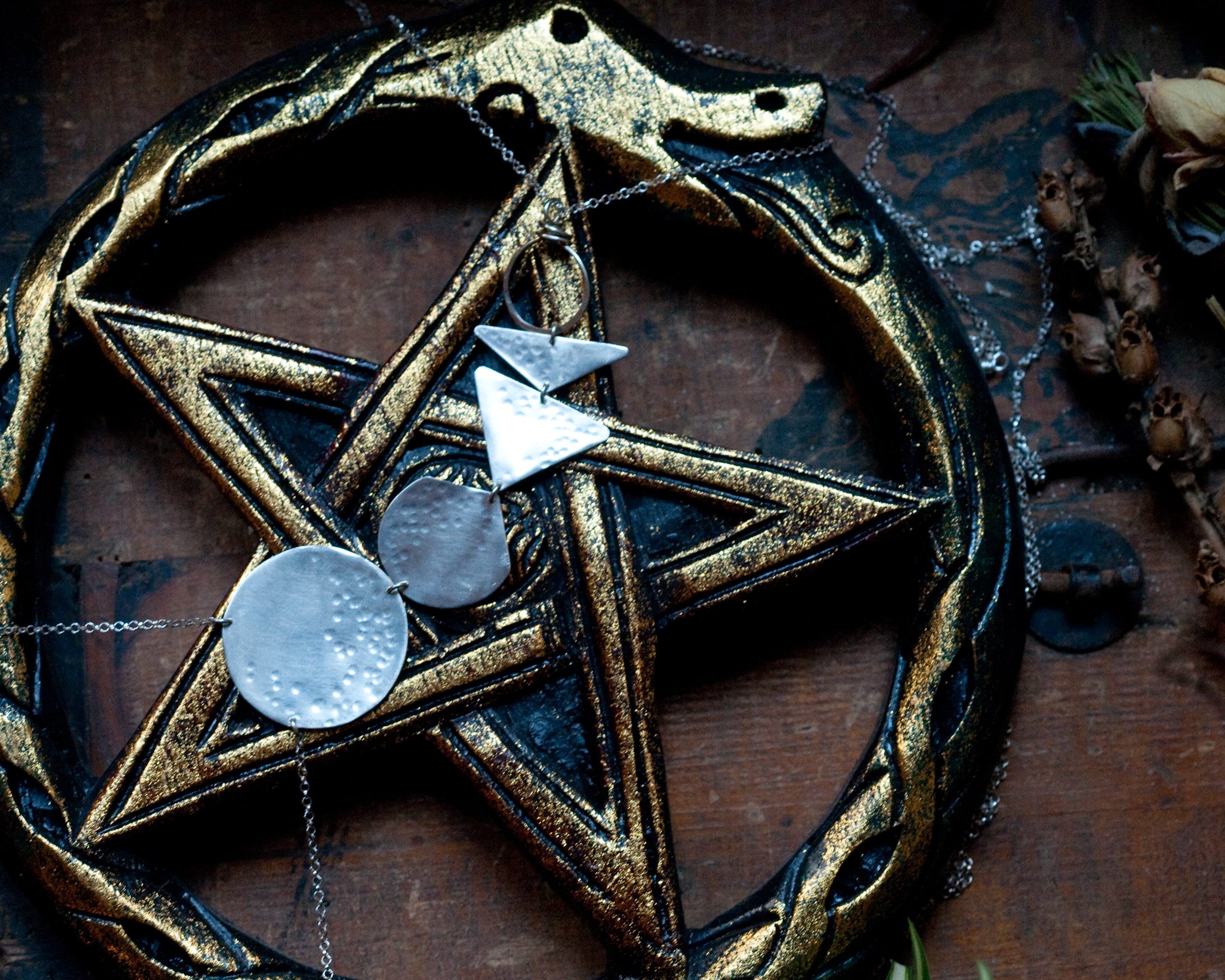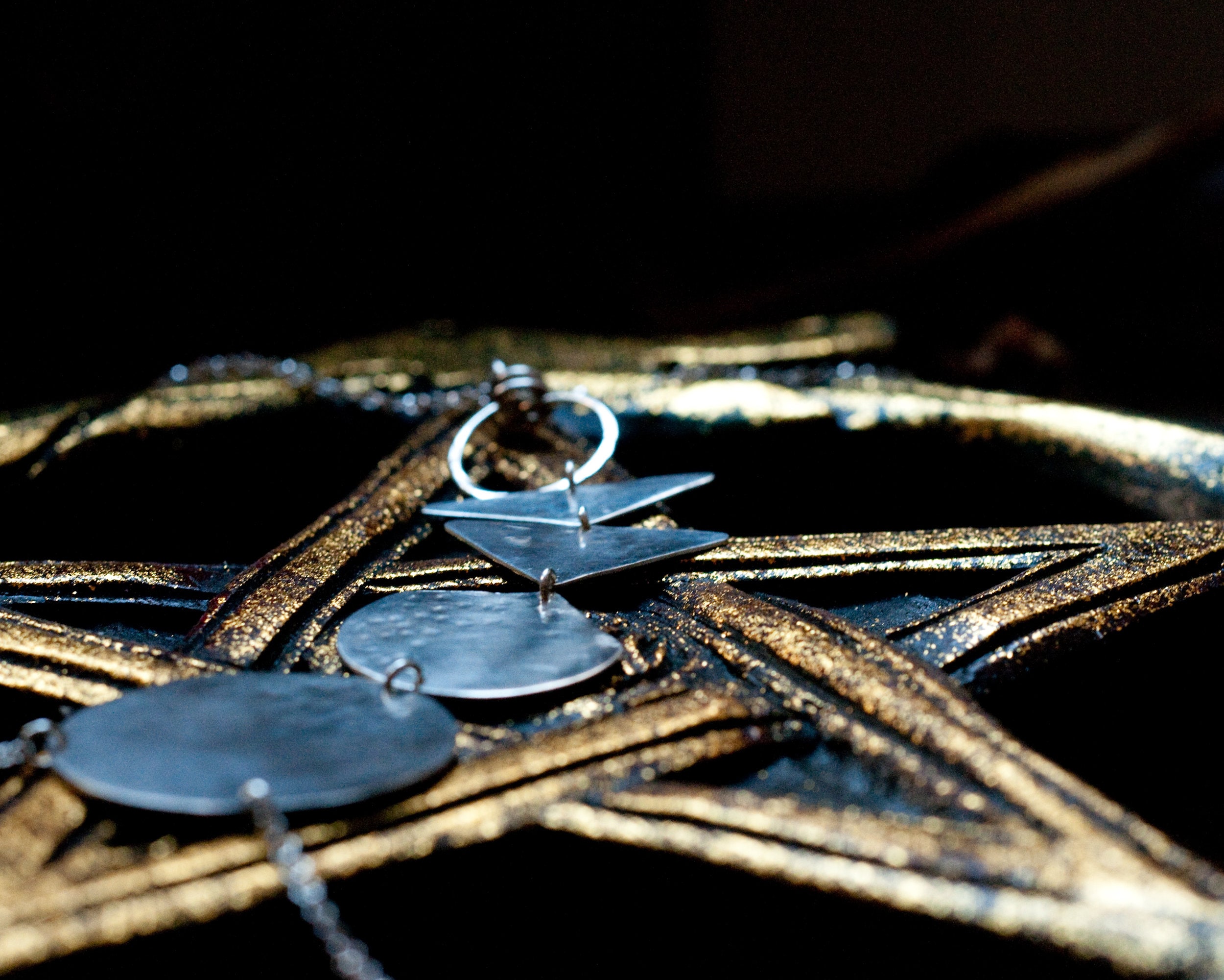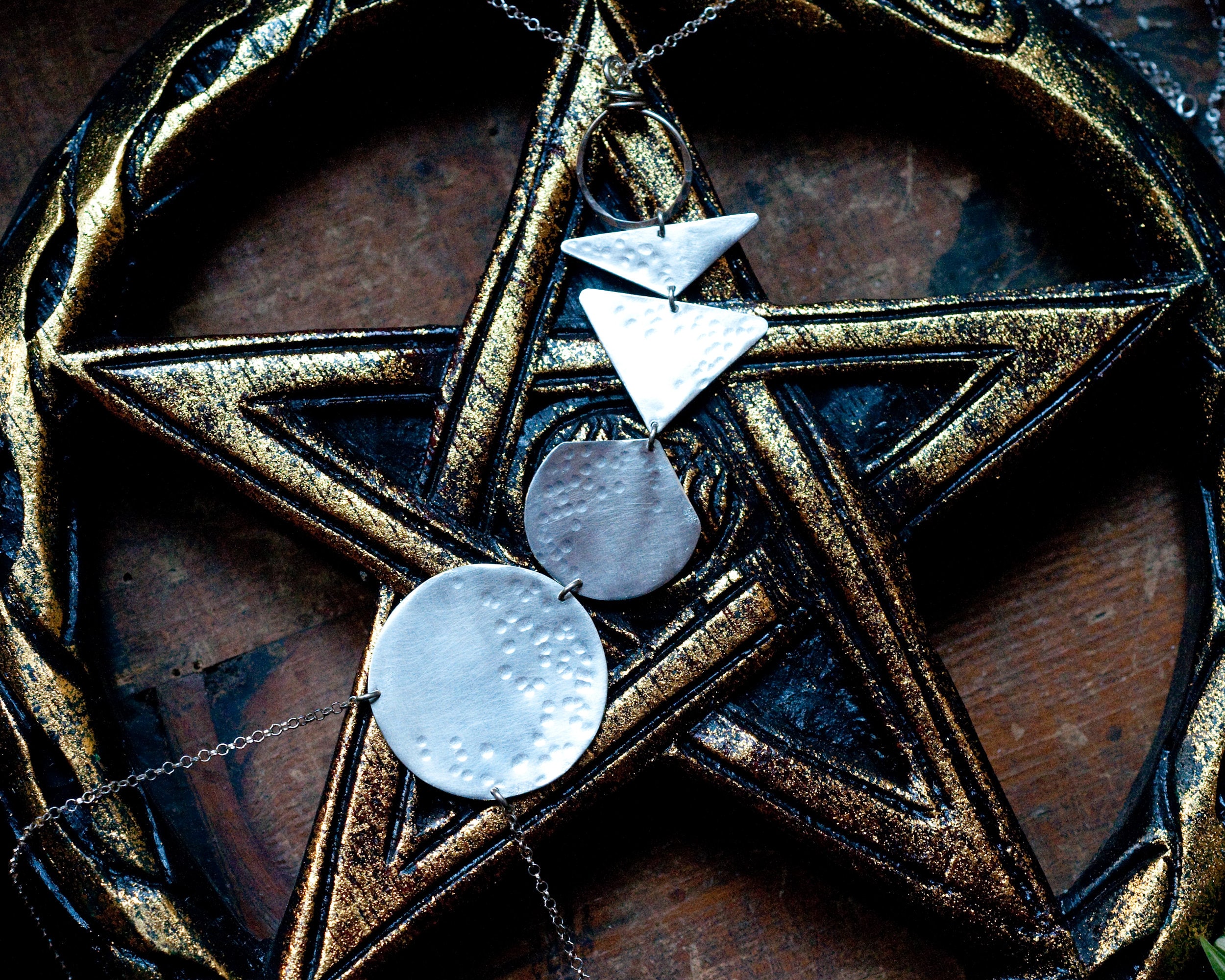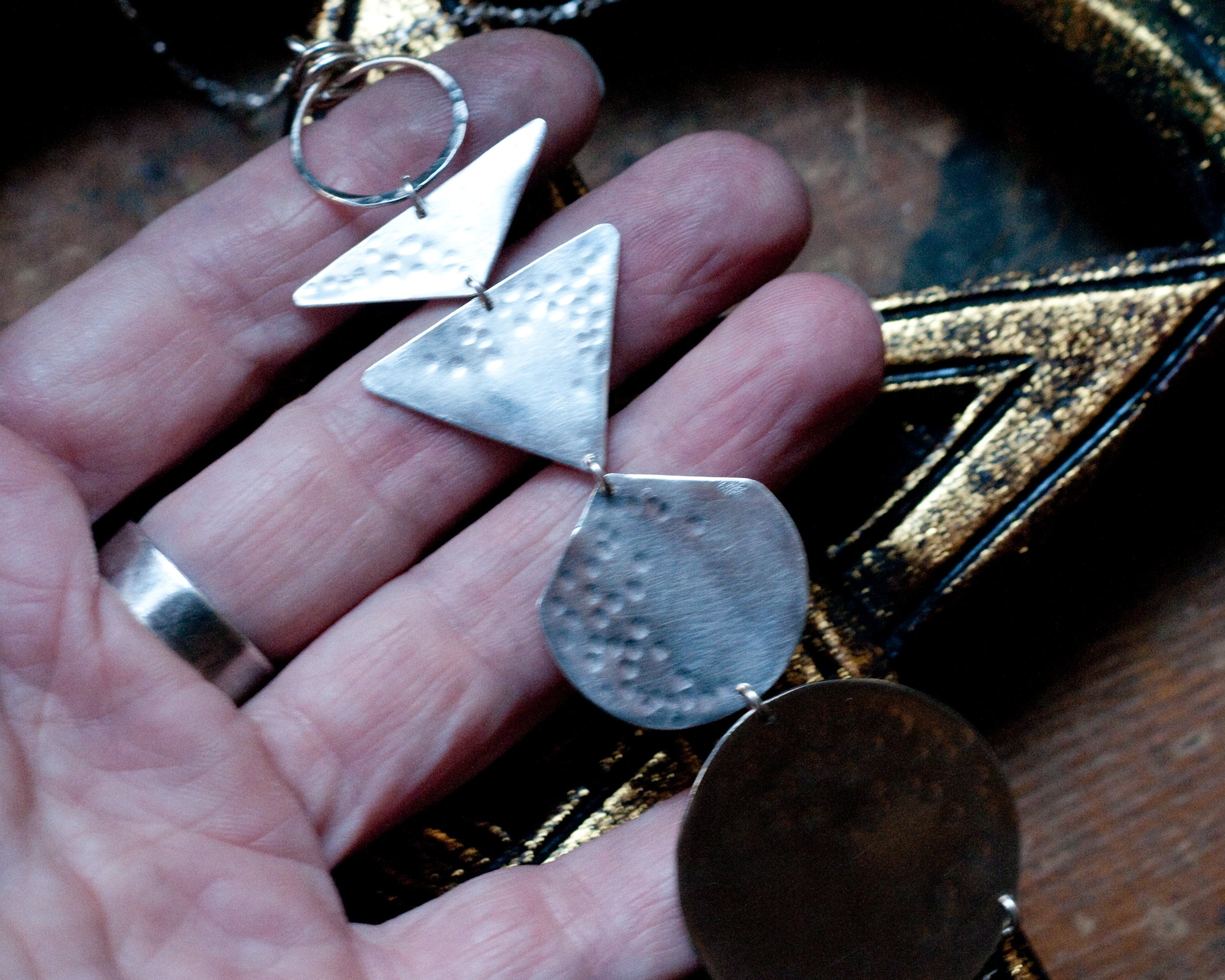 Taking inspiration from the lunar cycle this body chain uses geometric stylised designs to represent the new, crescent, half, gibbous and full moons. Each moon uses hand cut and hammered 0.5 mm sterling silver sheet (the new moon is fabricated from 18 gauge sterling silver wire). It can be polished or with a dark oxidised patina.