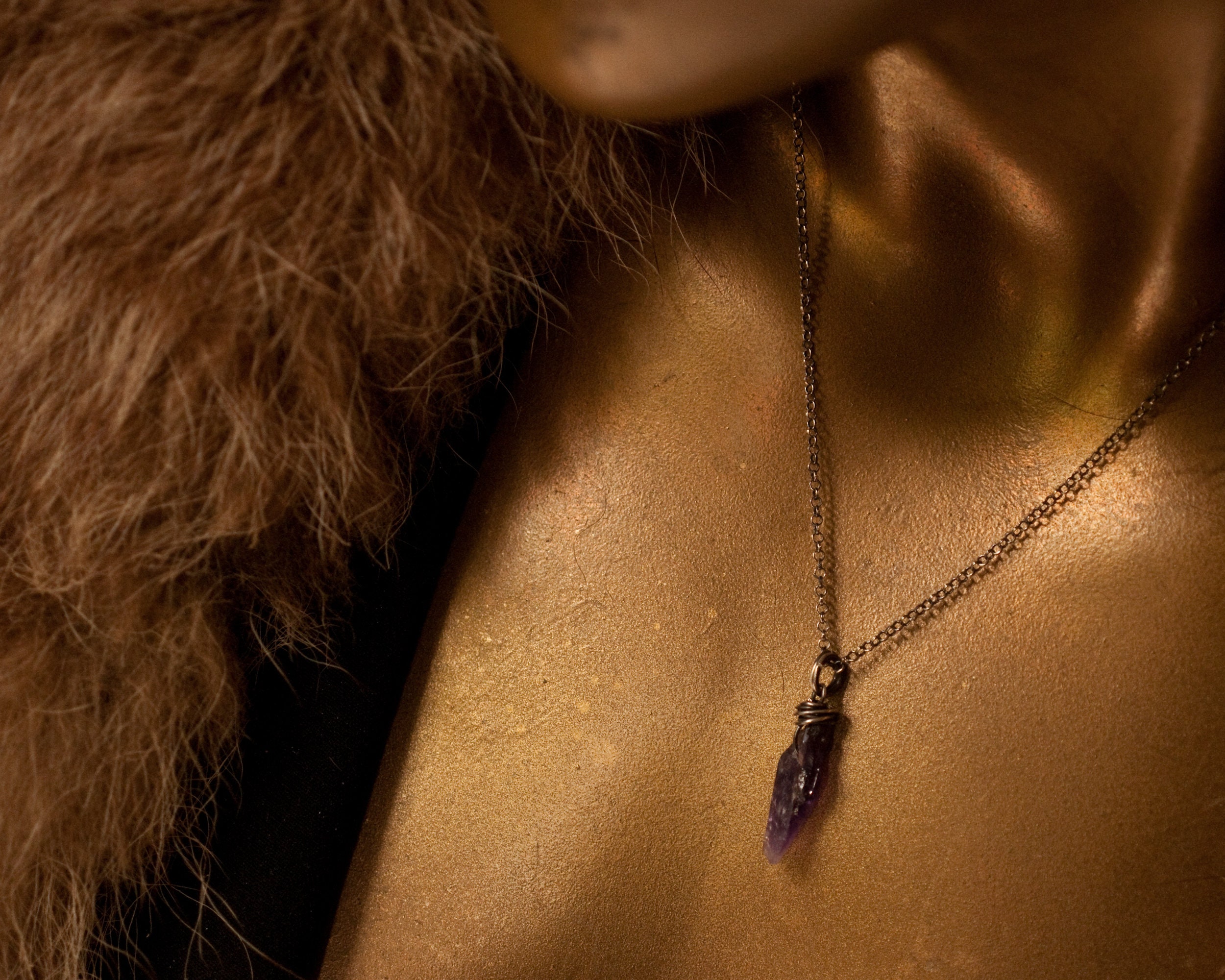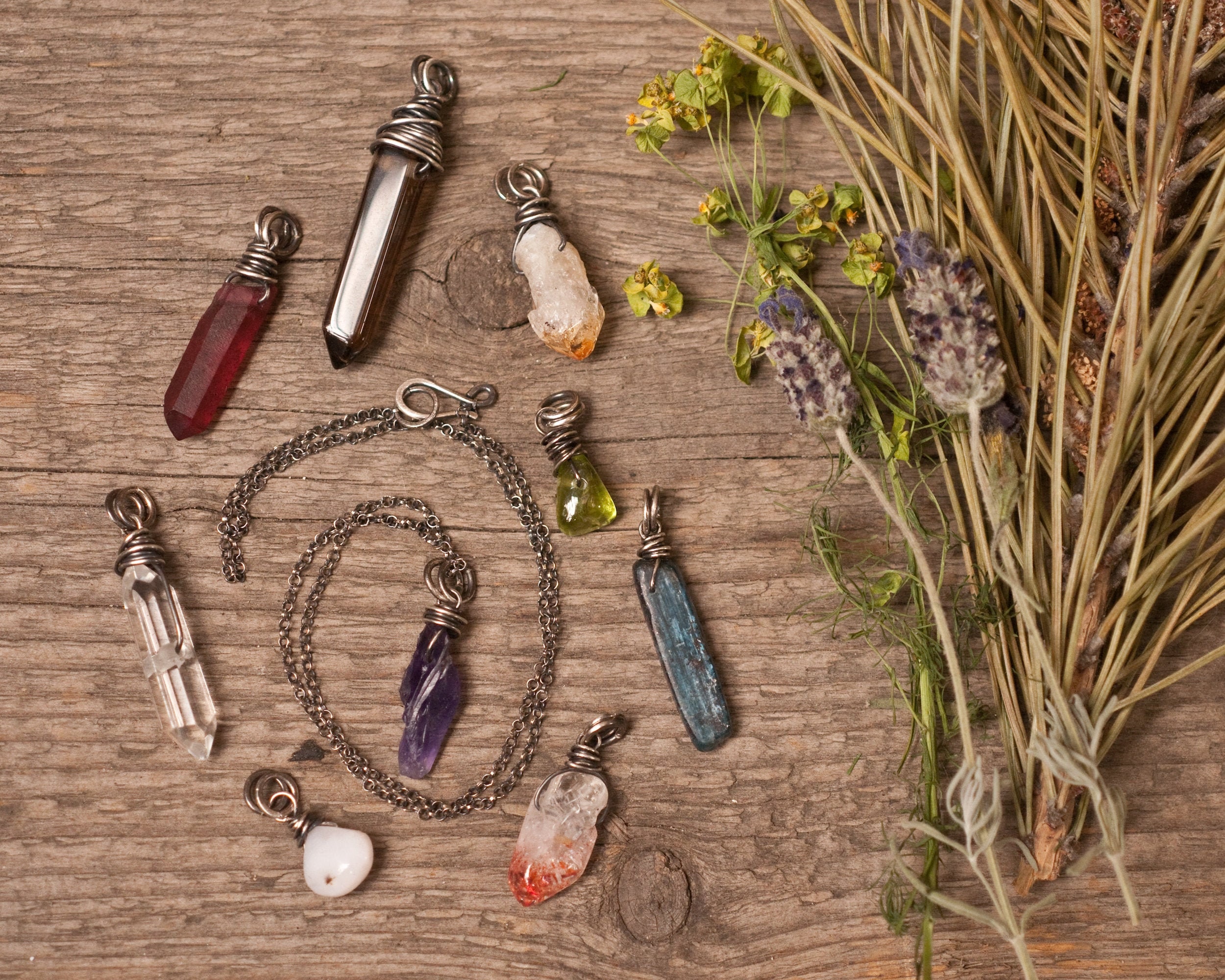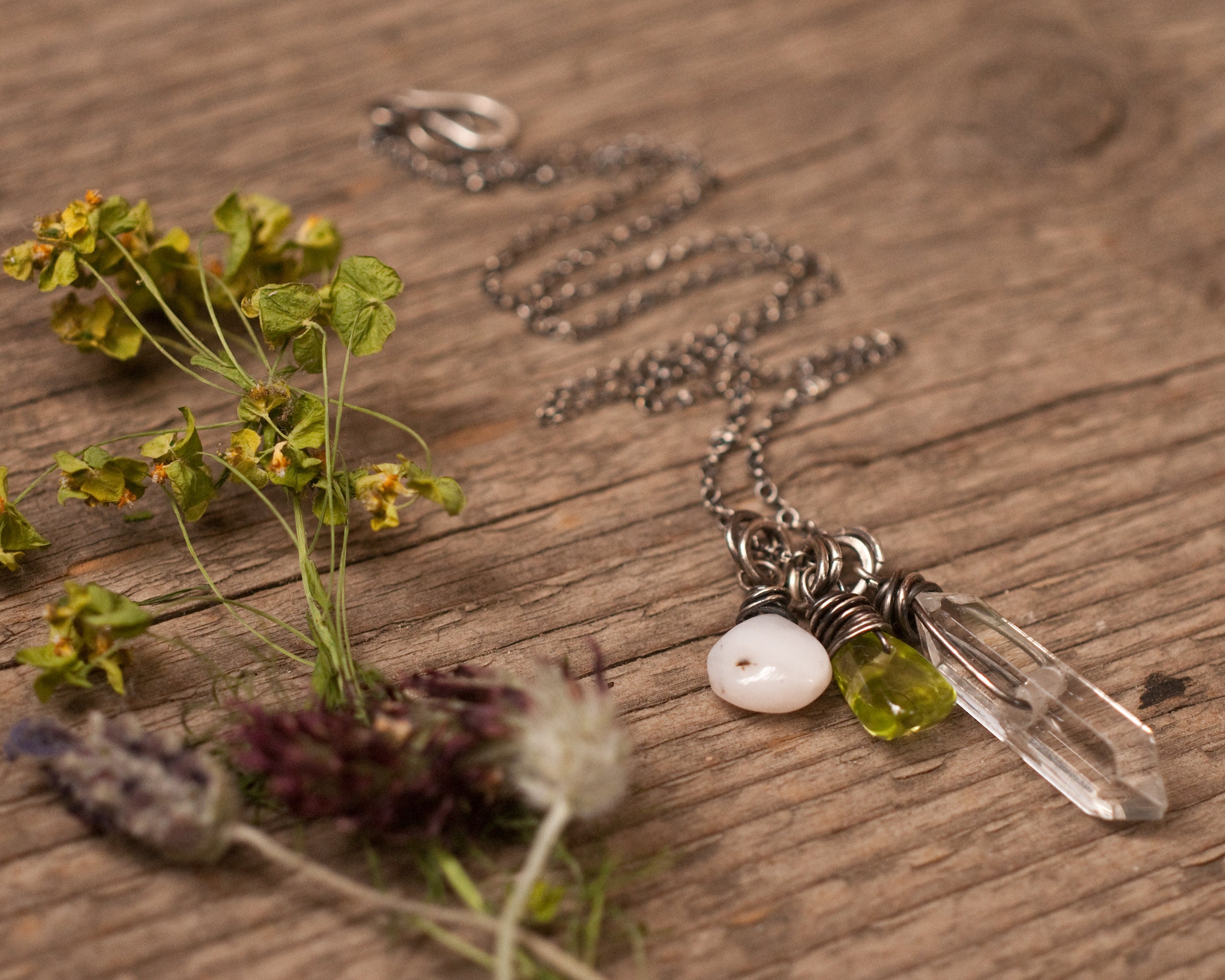 The chain is oxidised sterling silver and closes with a hook that also allows you to thread the pendants onto the chain securely without any danger of them slipping off once when the chain is open.