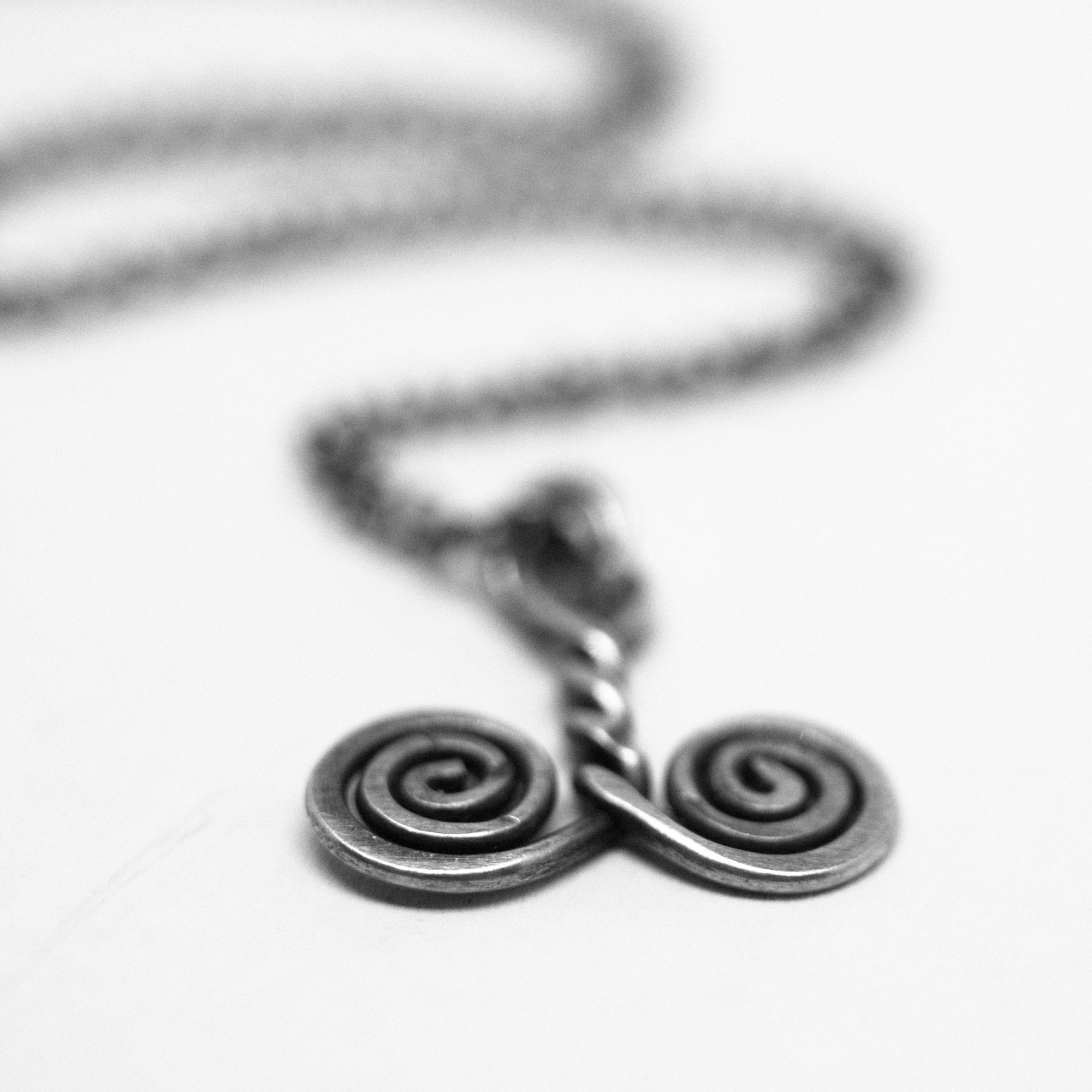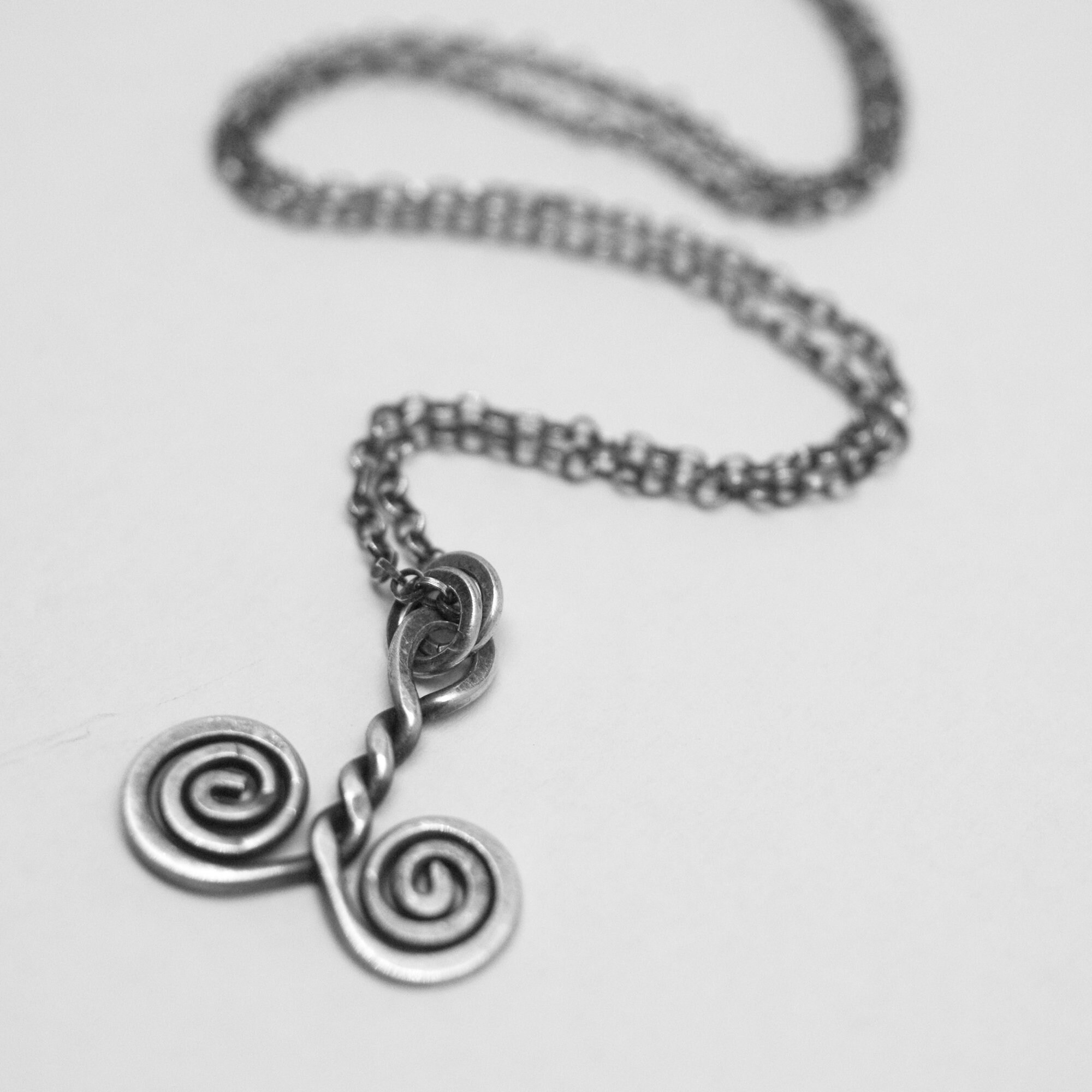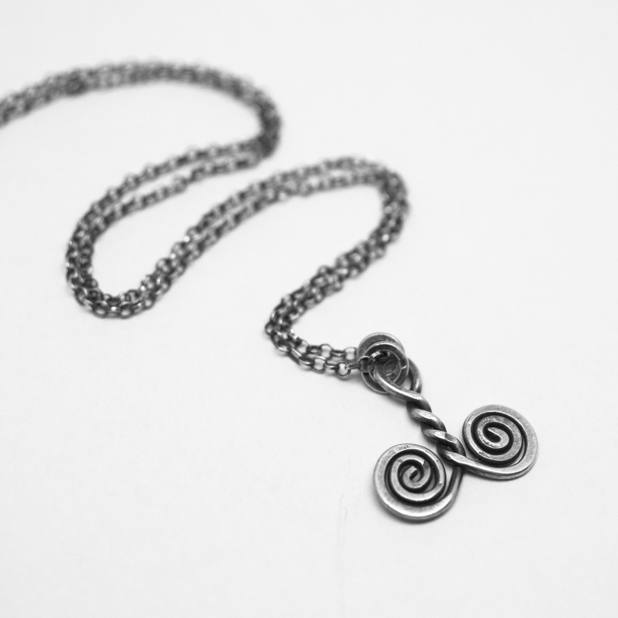 Each spiral is made from sterling silver and oxidised to bring out the richness and depth of the metal. The chains are also oxidised sterling silver, 16" and closes with spring ring clasps.